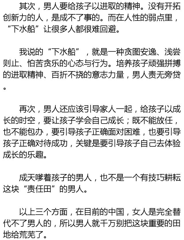 負起孩子教育和培養的責任,男人應該有男人的方法。男人給孩子的,主要的應該是精神的感召和意誌的榜樣。
